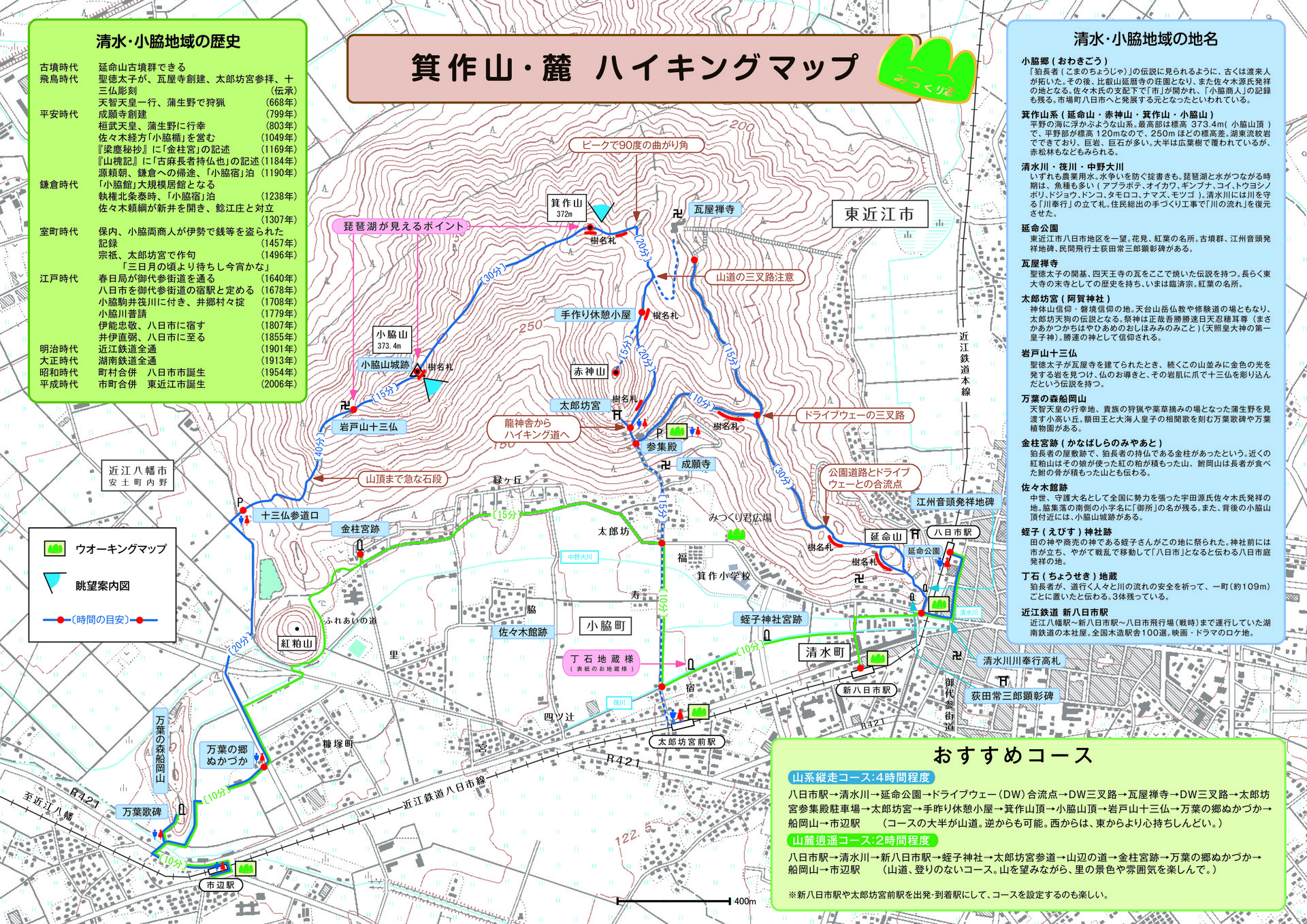マップを参考に、延命公園を登って瓦屋禅寺を参拝して箕作山の山頂を目指しましょう。