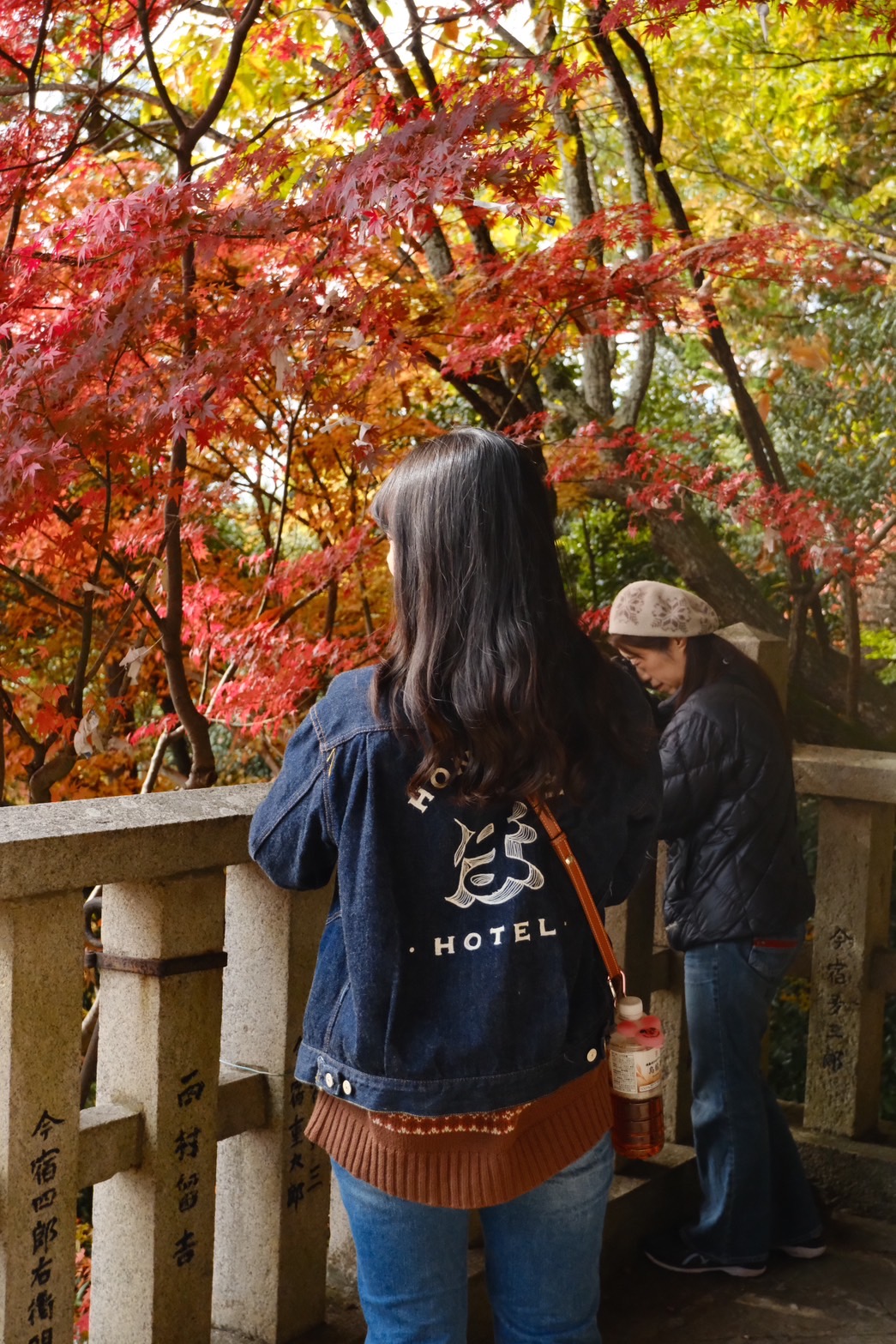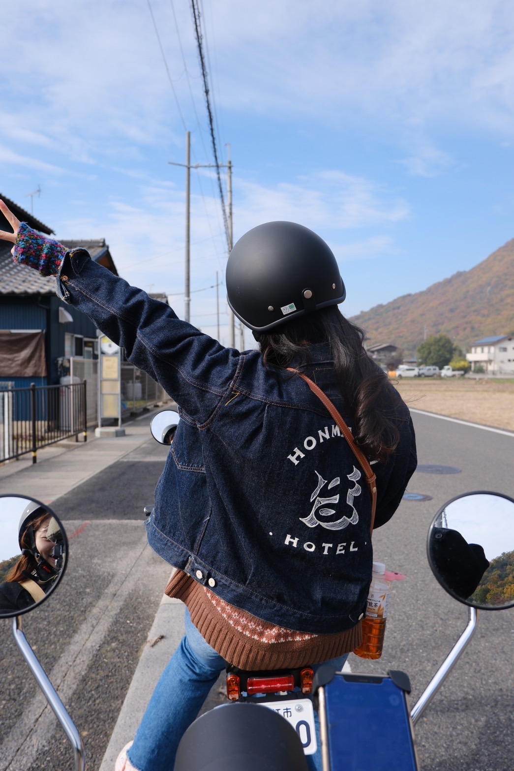 今回は、ほんまちホテルの宣伝にと、特別にホテルの制服であるFORTYNINERSのデニムジャケットを着てお出かけくださいました。