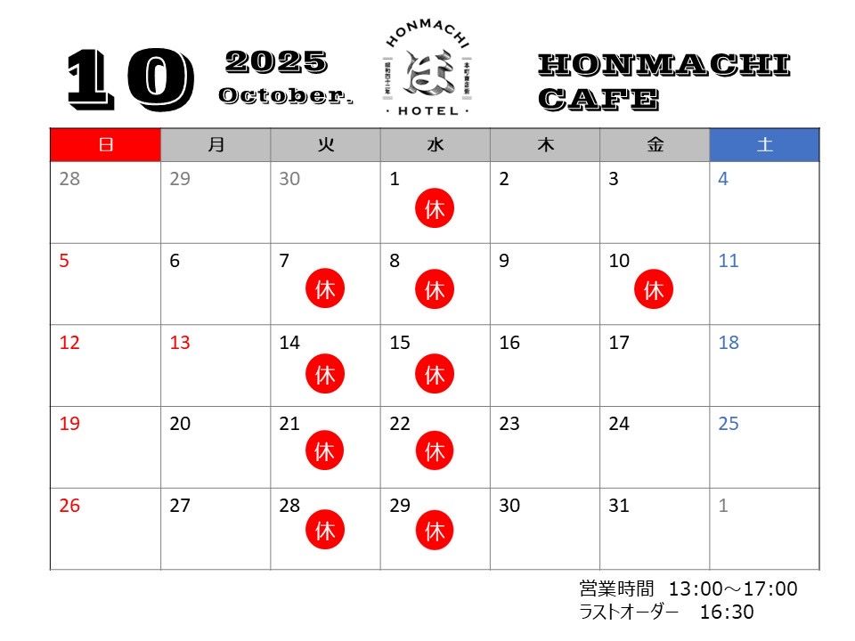 2025.10.09 THUほんまちカフェ10月の営業カレンダーです。