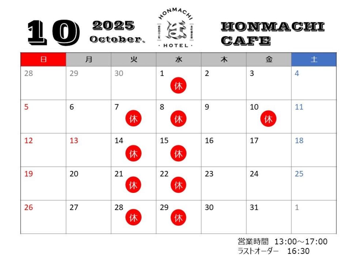 ほんまちカフェ10月の営業カレンダーです。